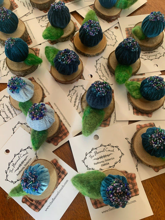 The Flannel Couch offers both wild Ontario Mushrooms. foraged, cleaned, preserved and assembled. We also offer handmade textile earrings in both cotton and velvet choices.