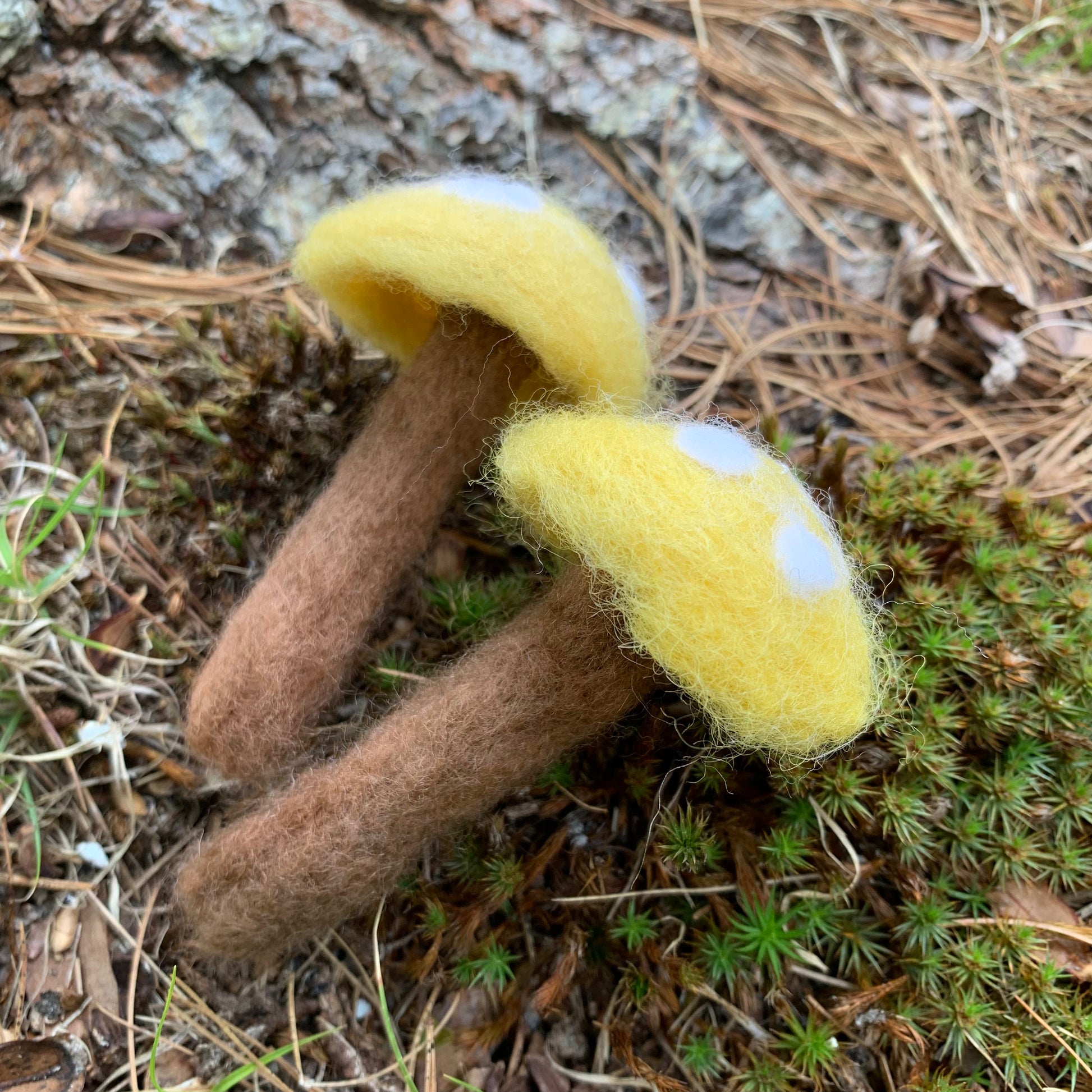 Twin Set:Two identical handmade textile mushrooms.