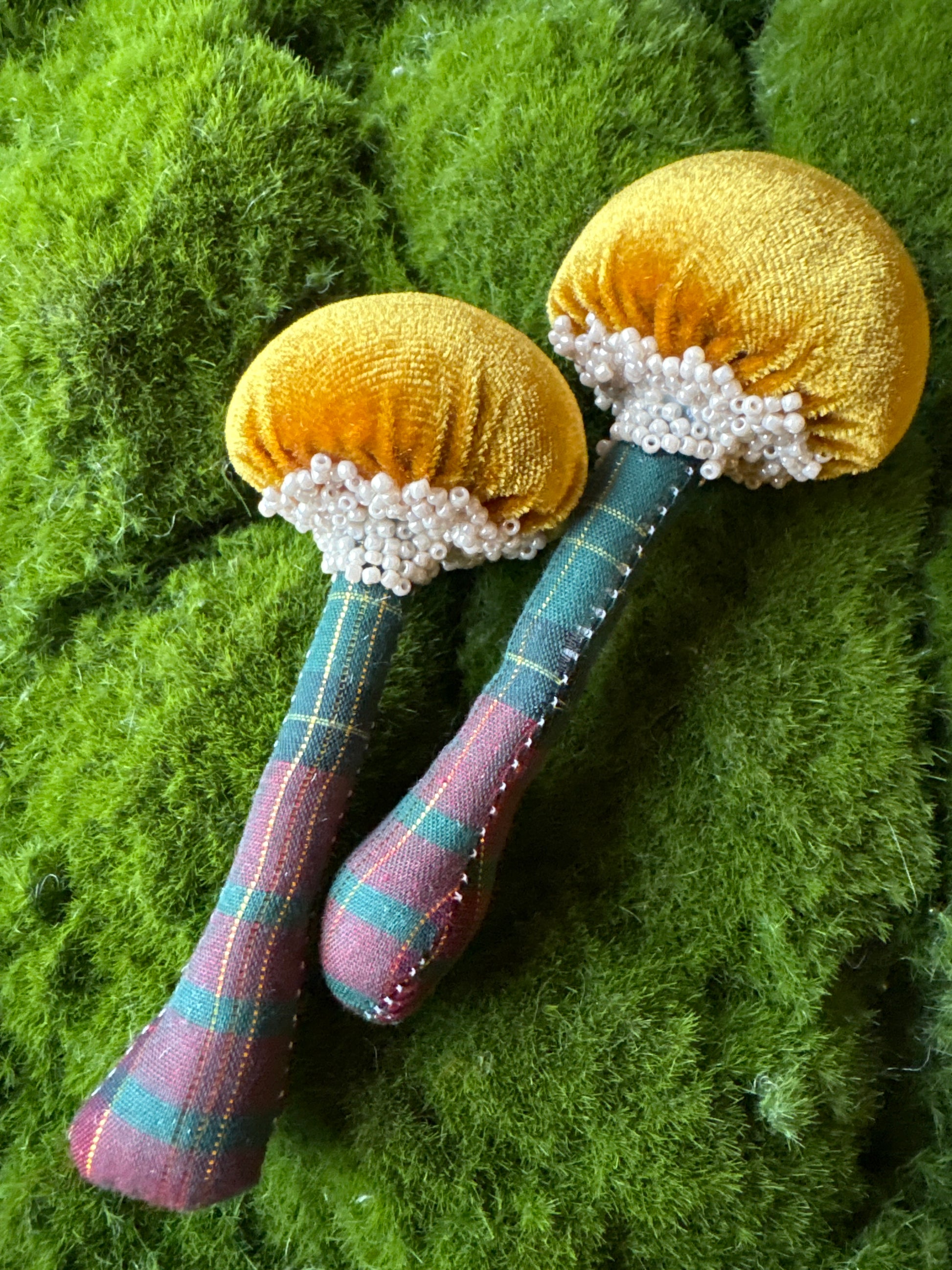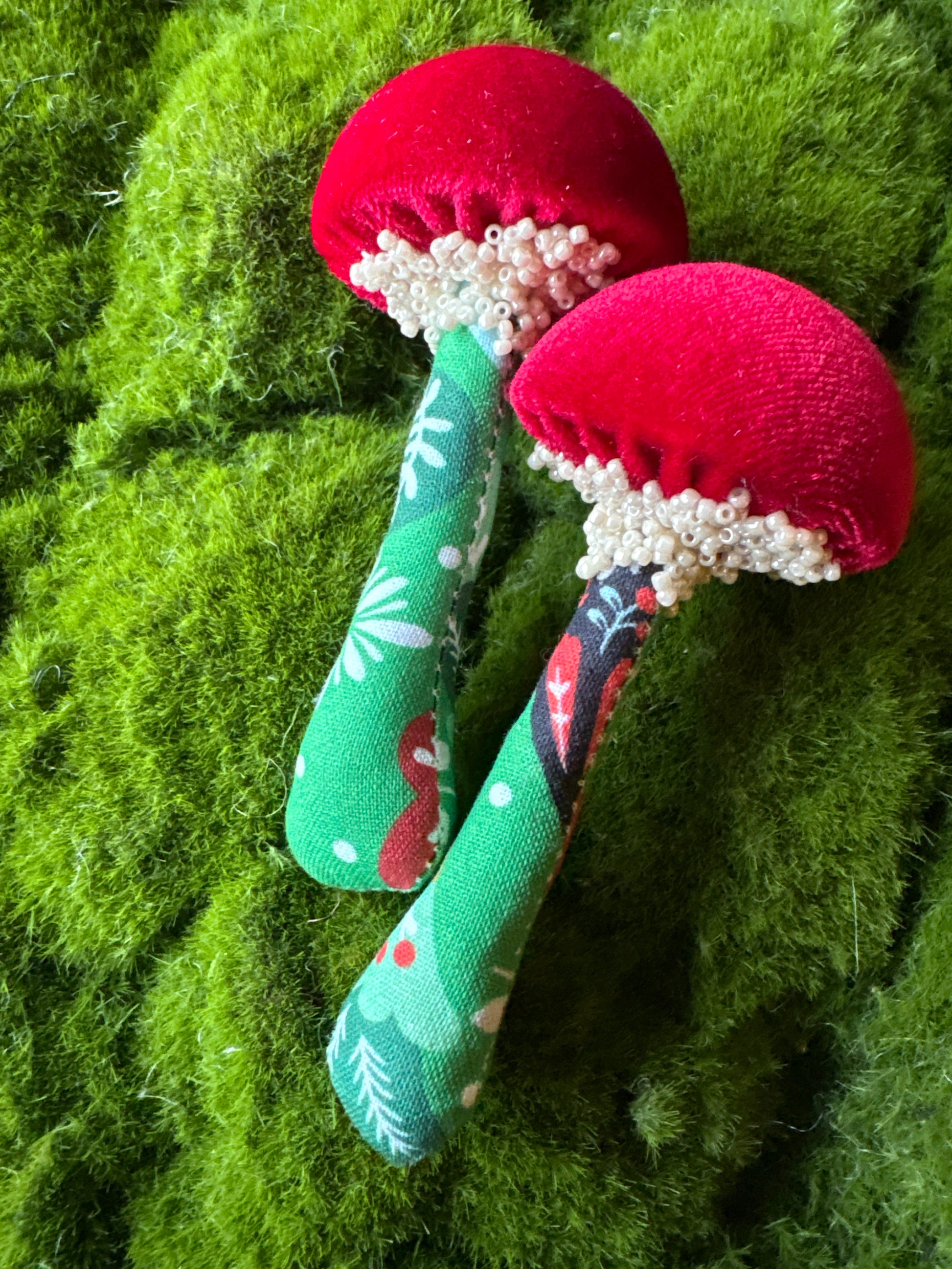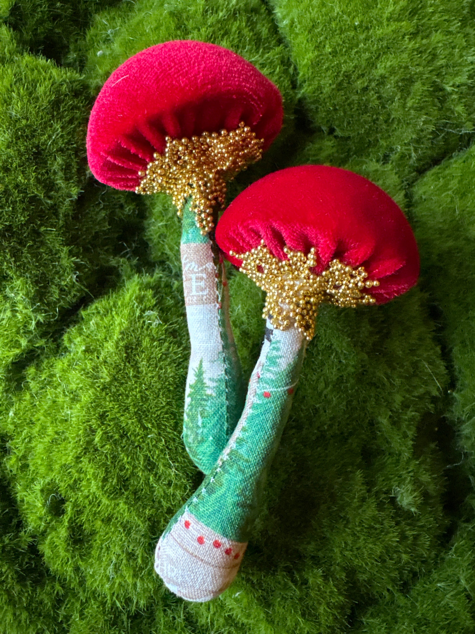 Twin Set:Two identical handmade textile mushrooms.