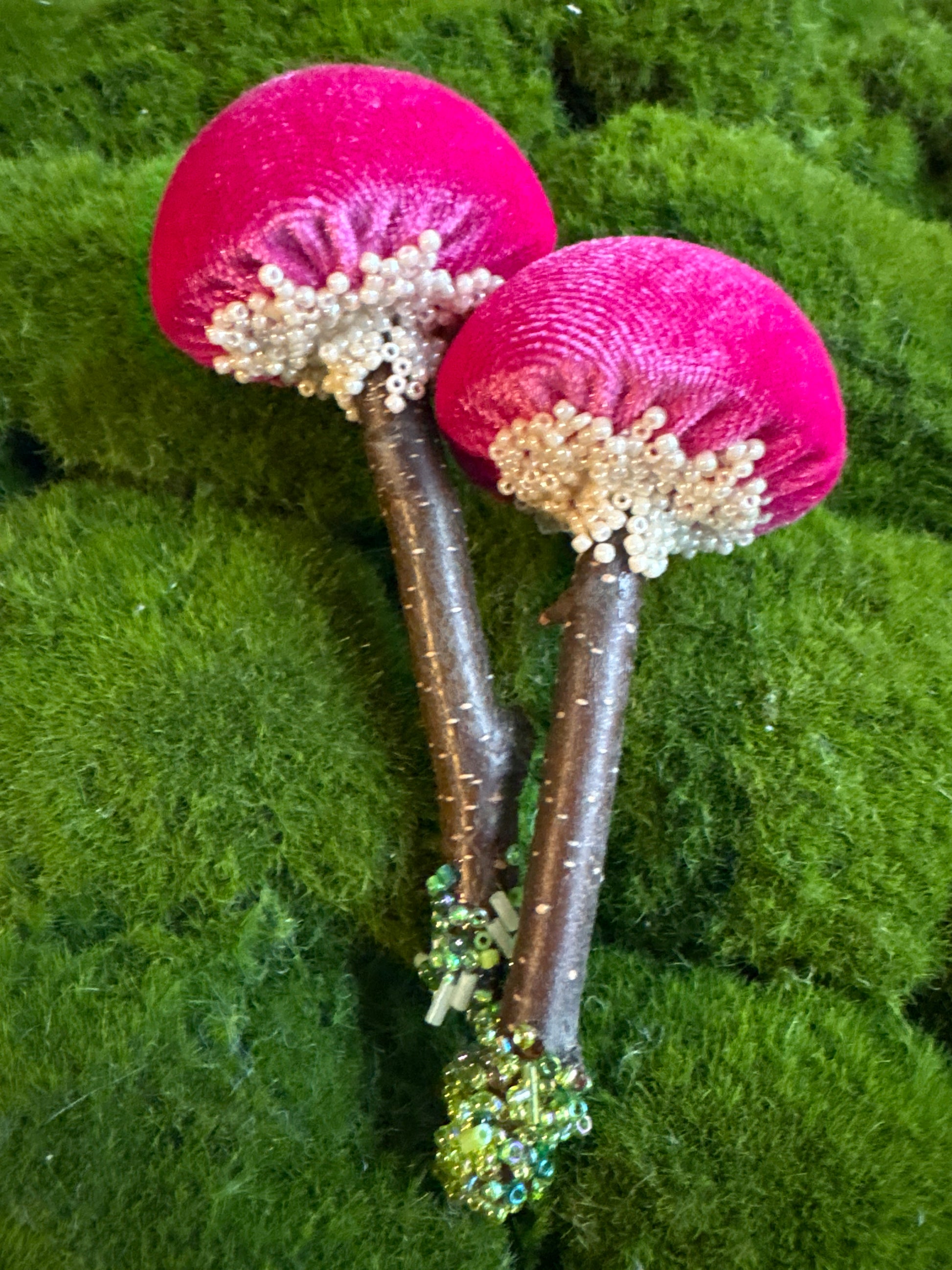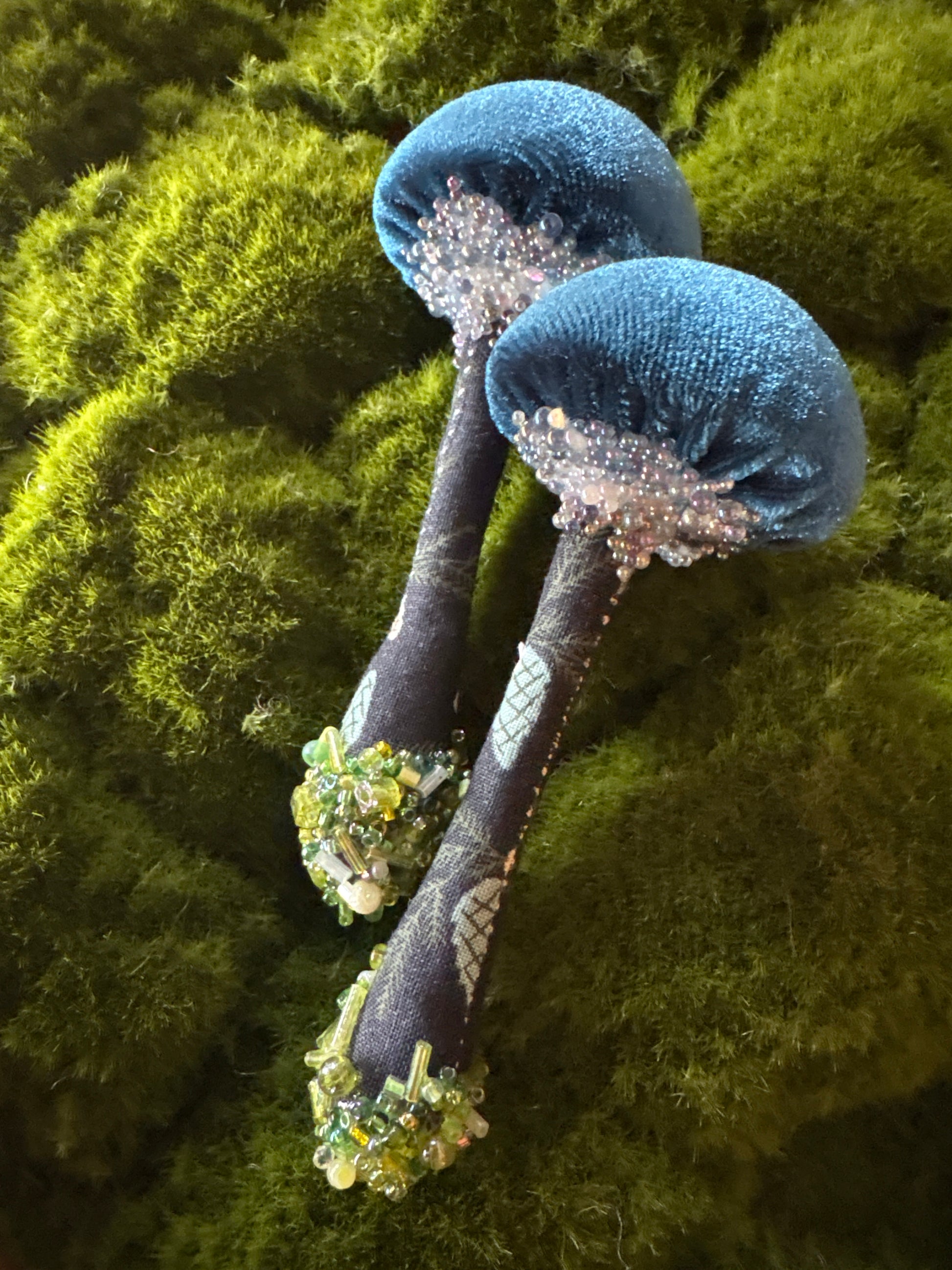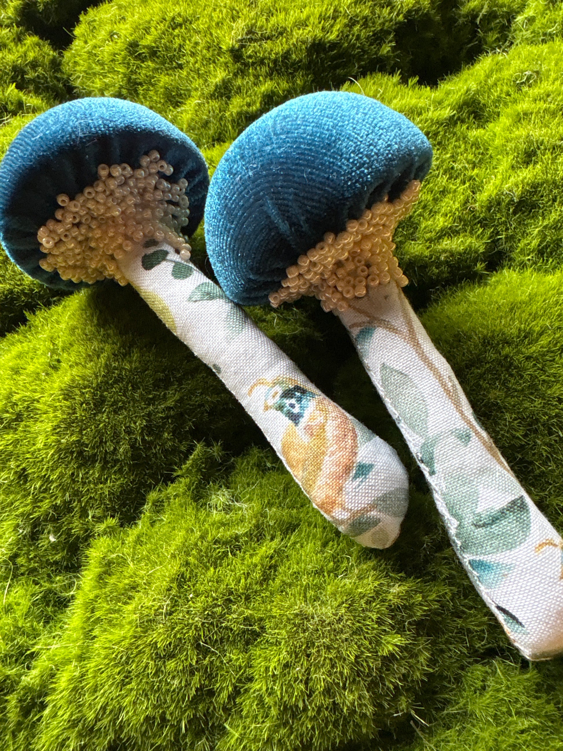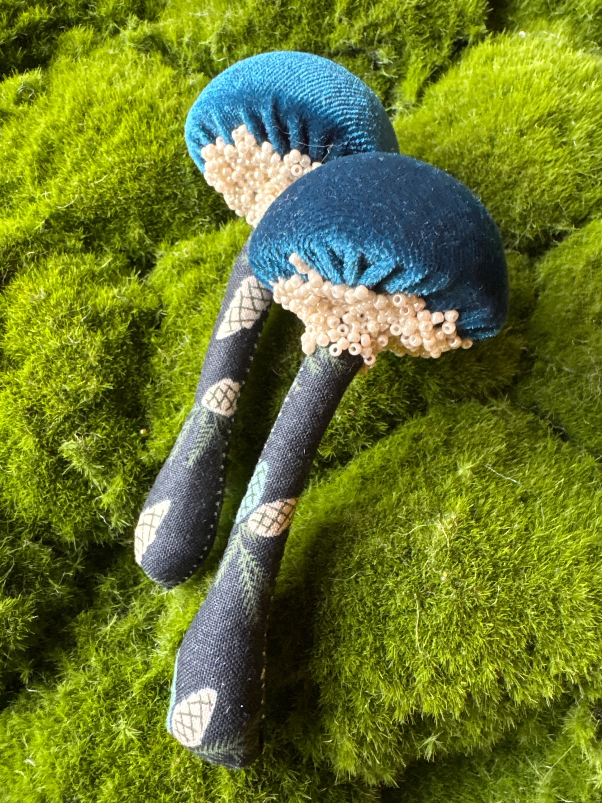 Twin Set:Two identical handmade textile mushrooms.