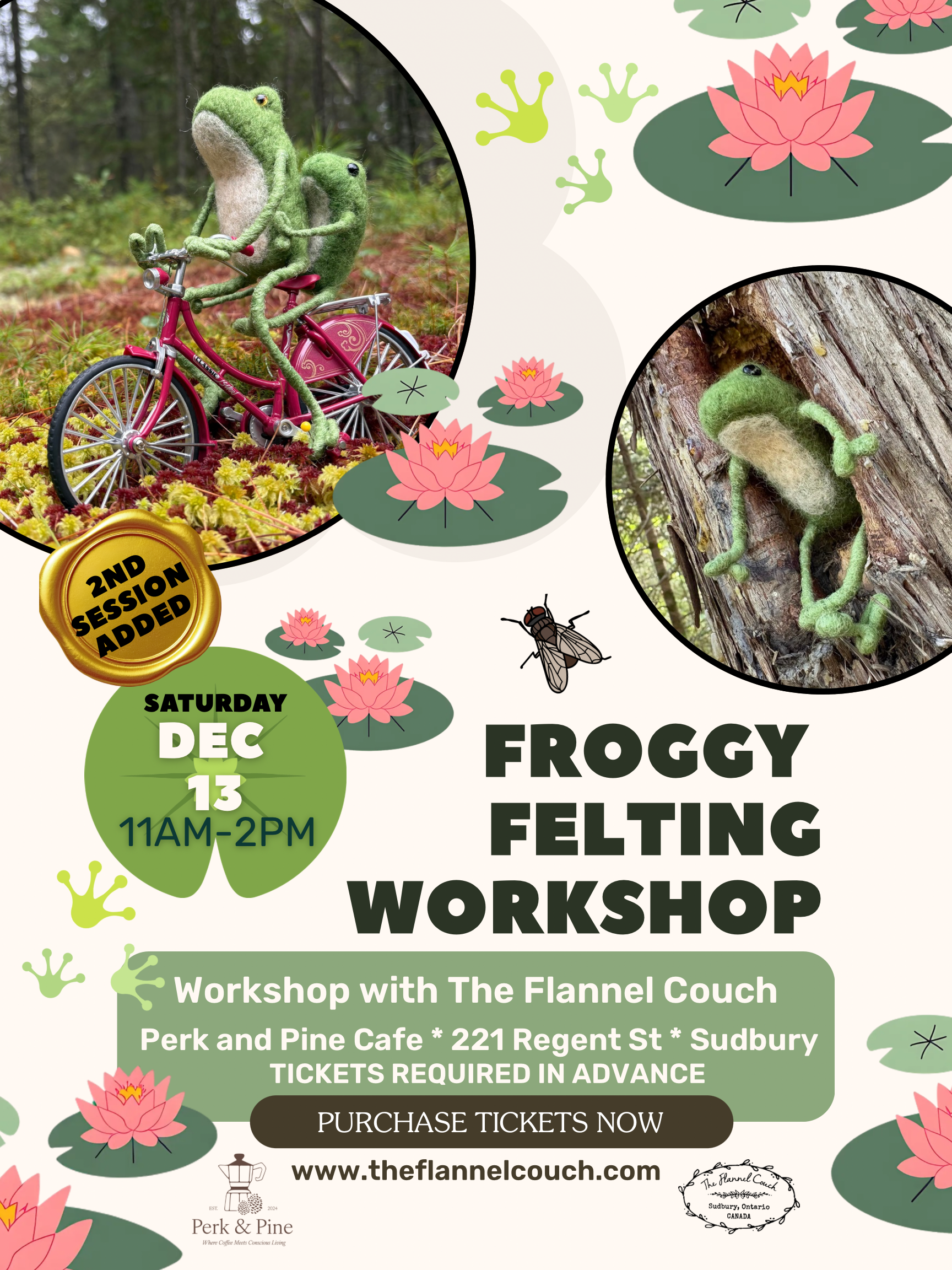 Tickets now available: Limited tickets. Tickets are required in advance. Please reserve your seat, registrations are now open at www.theflannelcouch.com The ticket covers the workshop and materials, while any food or beverage from Perk and Pine Cafe is separate."